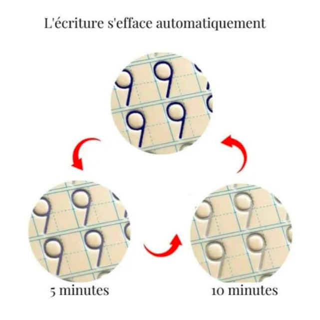 Grâce à l'encre spéciale, chaque tracé s'efface automatiquement en 10 minutes, permettant à votre enfant de réutiliser les pages à l’infini. Plus besoin de feuilles jetables ou de cahiers à usage unique !